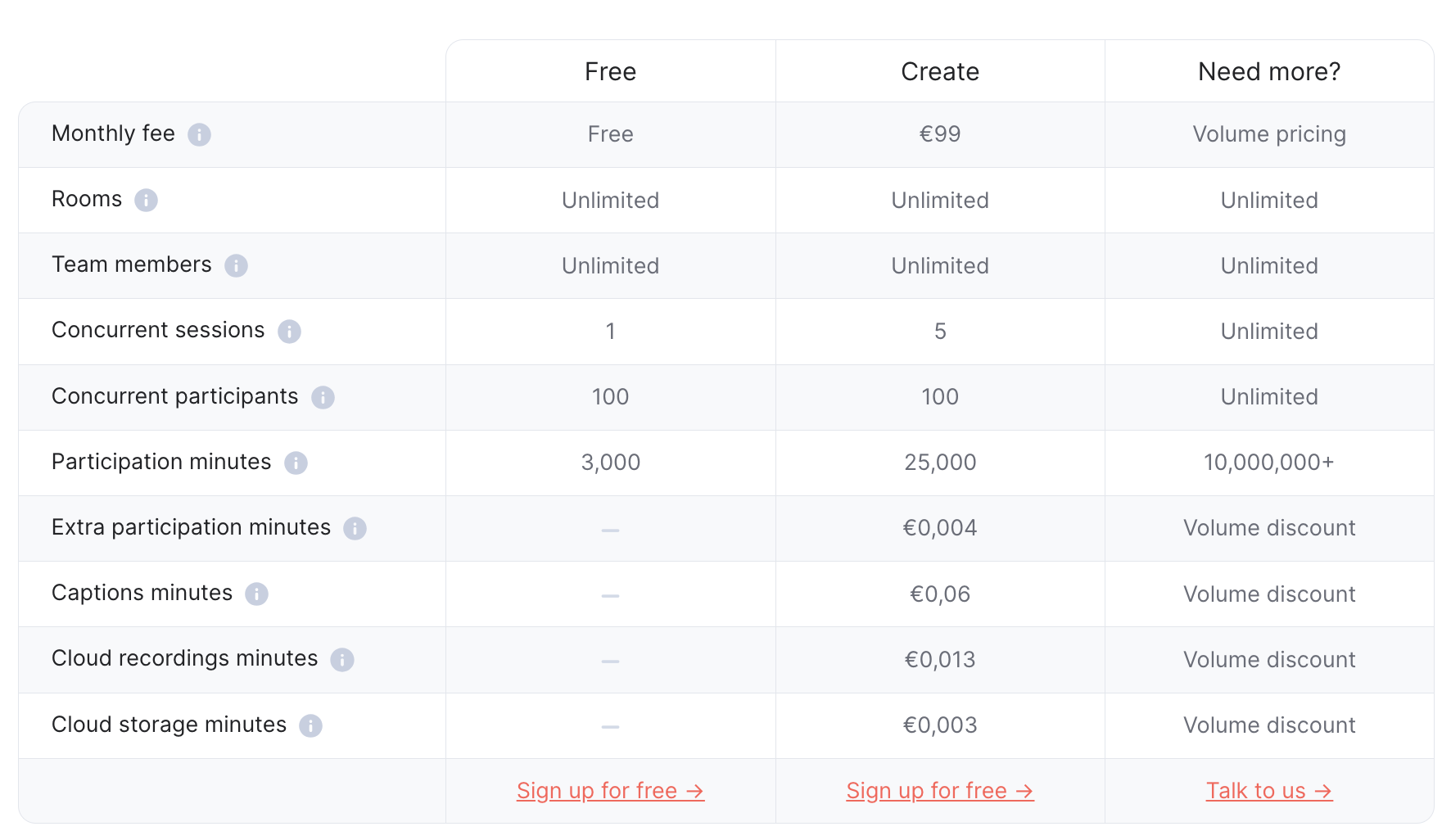 To make entry into the world of Digital Samba easier than ever, we offer a free plan that allows developers to get convinced of performance and get the largest part of development done without spending a cent.