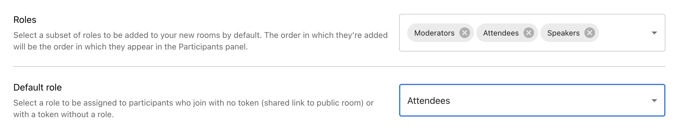 As a team member, you can select a subset of roles for each room that you create. This means that users joining this room will have to join with one of these roles. For this to happen, you must set their role property in their token to match some of the added roles.
