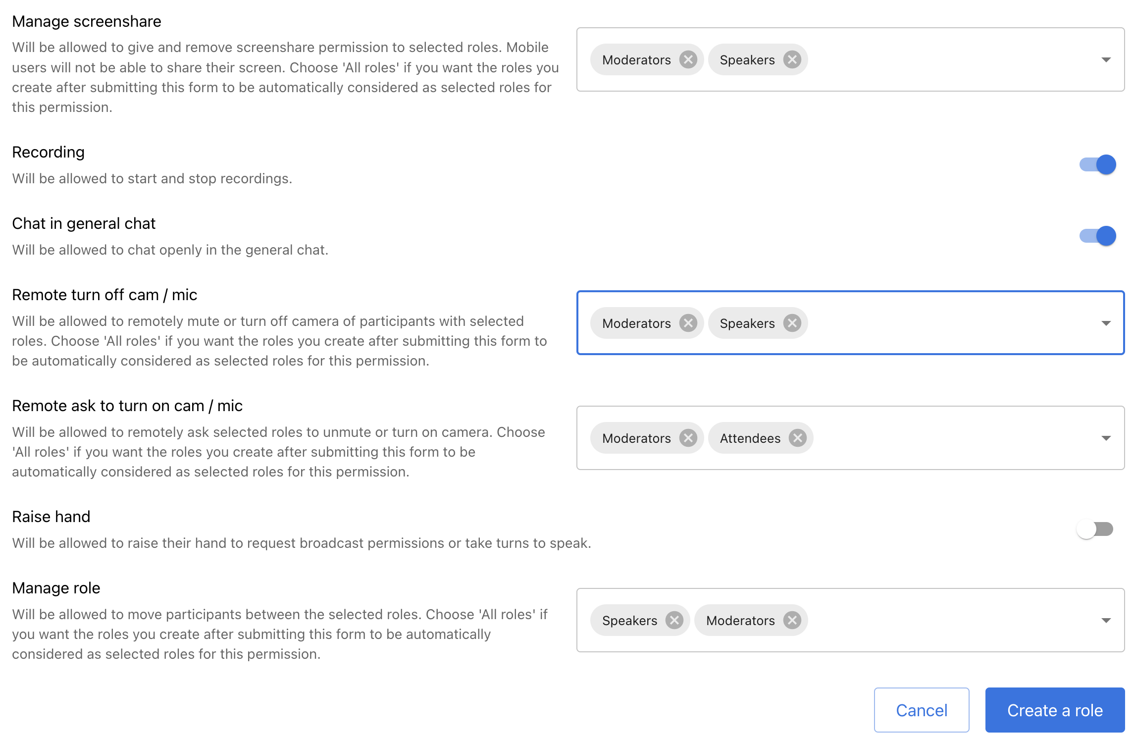 Our latest addition comes with three preset roles — Moderator, Speaker and Attendee — designed to cater to the most common use cases.