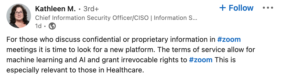 Source: Zoom: How Zoom’s terms of service and practices apply to AI features (August 7, 2023)