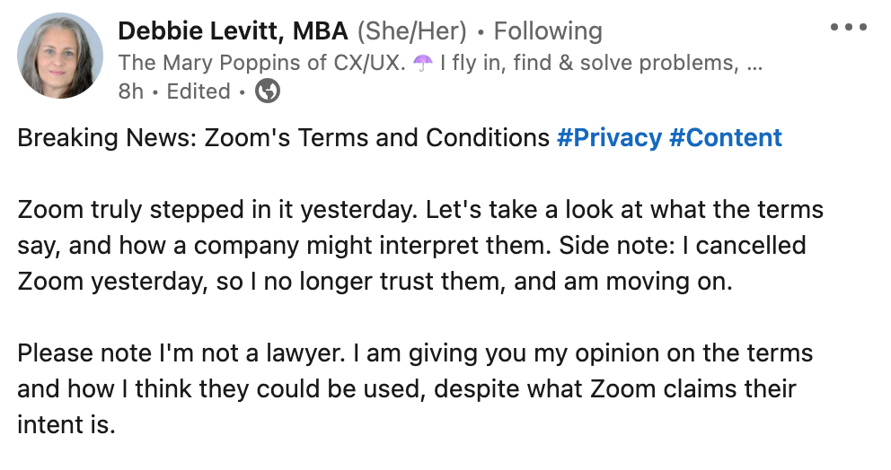 The crux of the update was that Zoom could use data from its customers’ calls to enhance their AI. This means that the content of your business meetings could potentially be used to train Zoom's AI. And let's be real, many of us don't regularly read the terms and conditions, do we?