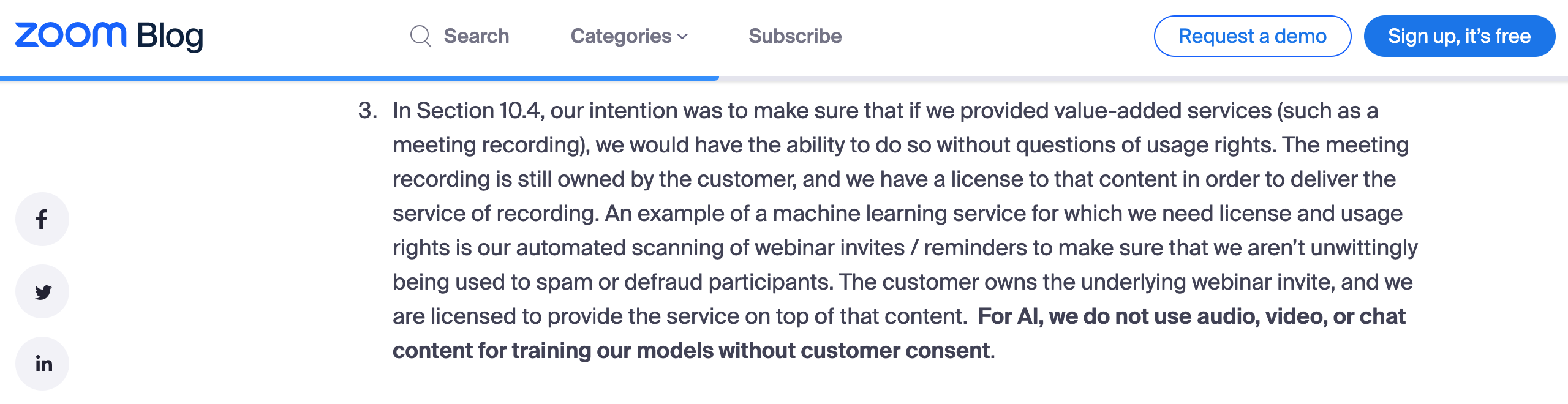 A Newsweek article fairly pointed out that Zoom's response might not have covered all user concerns, especially about joining AI-enabled meetings.