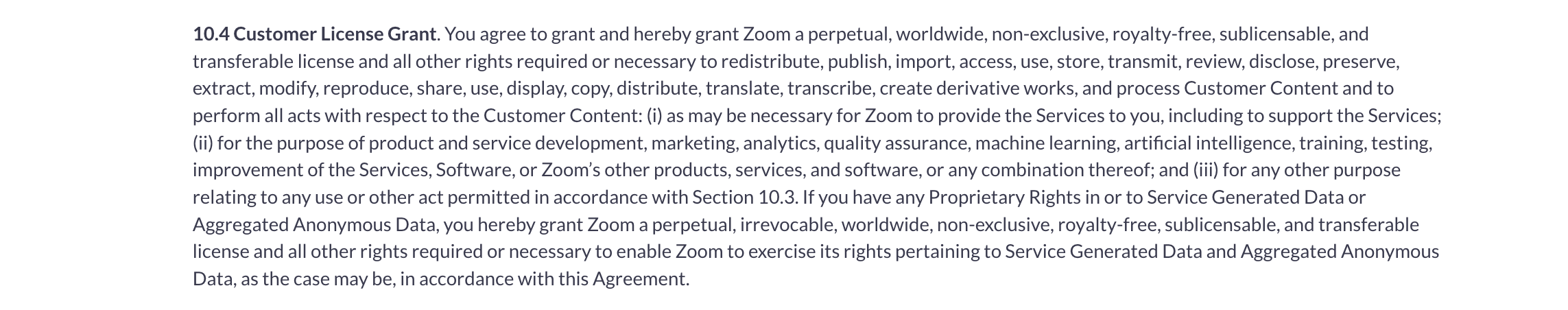 “In Section 10.4, our intention was to make sure that if we provided value-added services (such as a meeting recording), we would have the ability to do so without questions of usage rights. The meeting recording is still owned by the customer, and we have a license to that content in order to deliver the service of recording. An example of a machine learning service for which we need license and usage rights is our automated scanning of webinar invites/reminders to make sure that we aren’t unwittingly being used to spam or defraud participants. The customer owns the underlying webinar invite, and we are licensed to provide the service on top of that content. For AI, we do not use audio, video, or chat content for training our models without customer consent.”